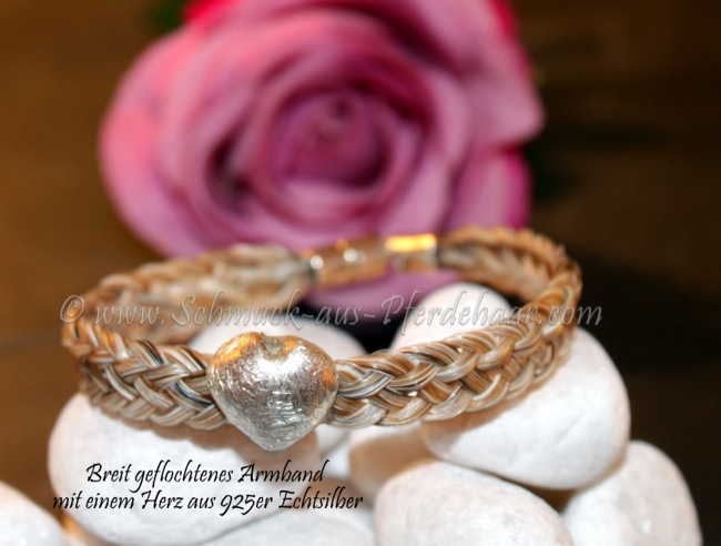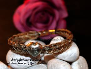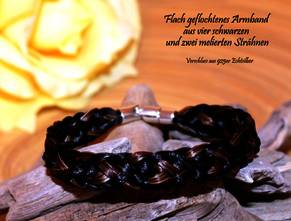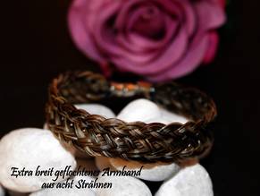 Breit geflochtene Armbänder sind eher schlicht. Sie lassen sich recht gut mit einem ovalen Silber- und Goldröhrchen kombinieren, da die flache Form der Schmuckstücke nicht so schön mit den runden Röhrchen harmonieren. Mehrere kleine Röhrchen sehen aber nicht sehr harmonisch aus, da sich jedesmal das Flechtmuster verengt und wieder weitet, was kein so schönes Bild gibt.