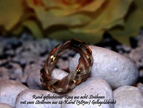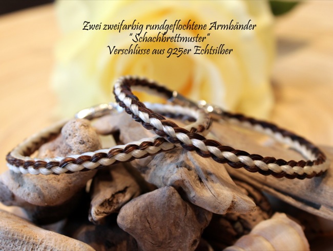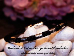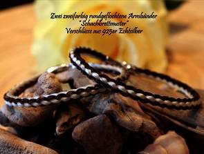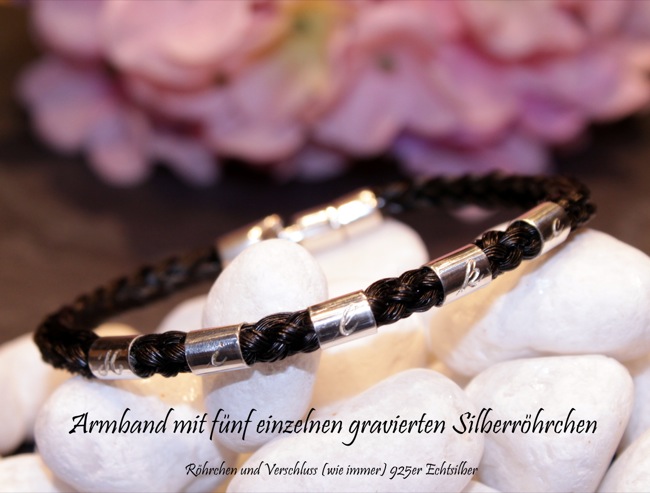 Rund geflochtene Schmuckstücke werden sehr gerne bestellt. Sie lassen sich perfekt mit gravierten Silber- und Goldröhrchen kombinieren. Swarovskis, Perlen, Silber- oder Goldsträhnen können sehr dekorativ mit eingeflochten werden. Sehr praktisch ist es, dass sie runde Schmuckstücke von alleine im Kreis biegen, so dass man Armbänder sehr leicht mit einer Hand an- und ablegen kann.